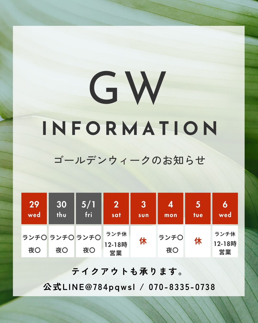 4月の営業カレンダーです。