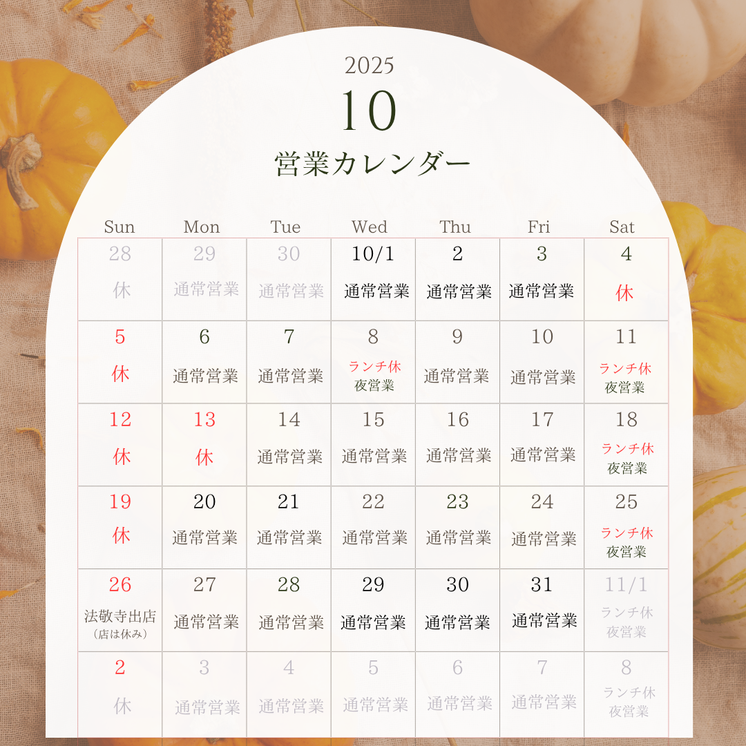 10月の営業カレンダー >>read more 2025 10/04 10月の営業カレンダーです。ご来店おまちしております! 10/4(土) 臨時休業いたします。 10/8(水) ランチタイムお休みをいただきます。夜は通常営業いたします。 information URLをコピーしました!