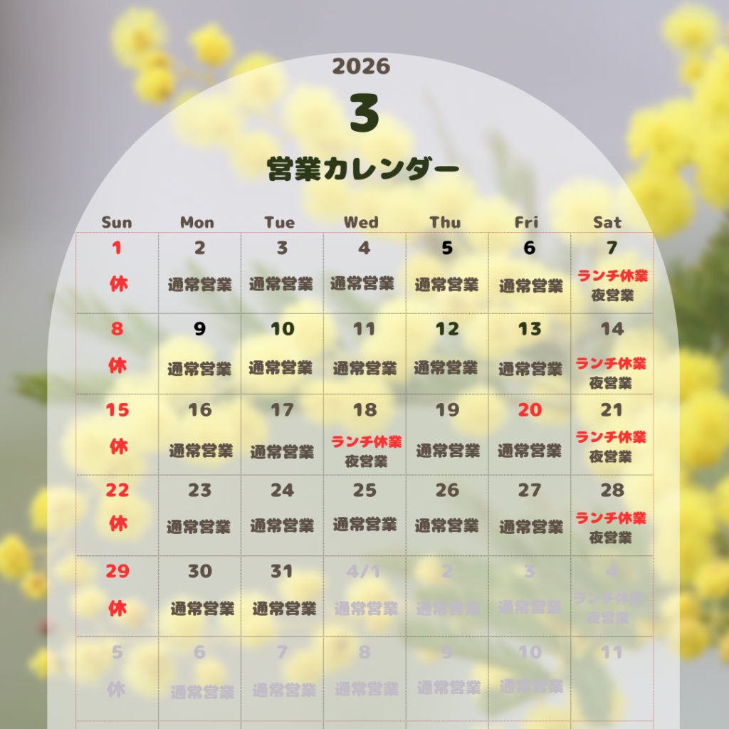 3月の営業カレンダー 2026 3/02 3月の営業カレンダーです。 3/18(水) 健康診断のため、ランチタイム休業いたします。 3/20(金) 春分の日で祝日ですが、ランチタイム営業予定です。 ご来店お待ちしております! information URLをコピーしました!